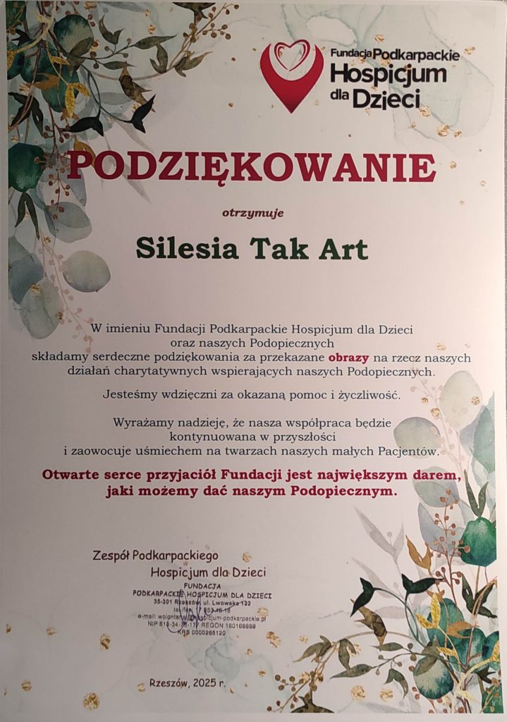 Od momentu powstania organizacji, zgodnie z przyjętymi celami statutowymi, Silesia Tak Art niesie pomoc potrzebującym oraz uczestniczy w wydarzeniach kulturalnych na terenie województwa śląskiego i kraju. W załączeniu kilkanaście podziękowań jakie otrzymaliśmy w latach 2013 – 2025 od obdarowanych i naszych partnerów.